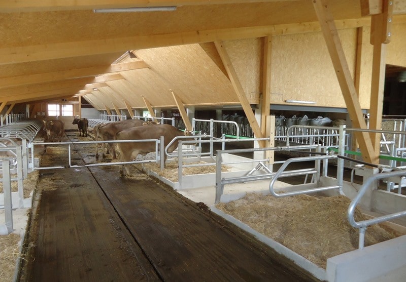 Projekt: Von der Projektierung bis zur Ausführung wurde der Boxenlaufstall für 36 Original Braunviehkühe von uns geplant und mit Schweizer Holz gebaut.