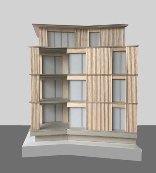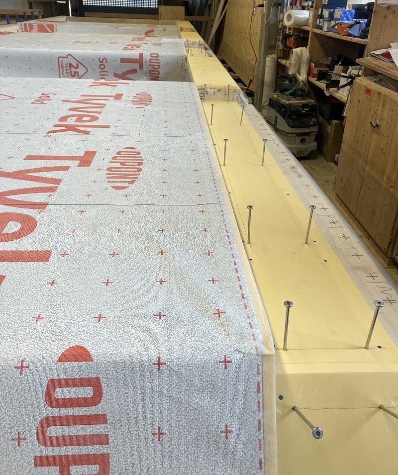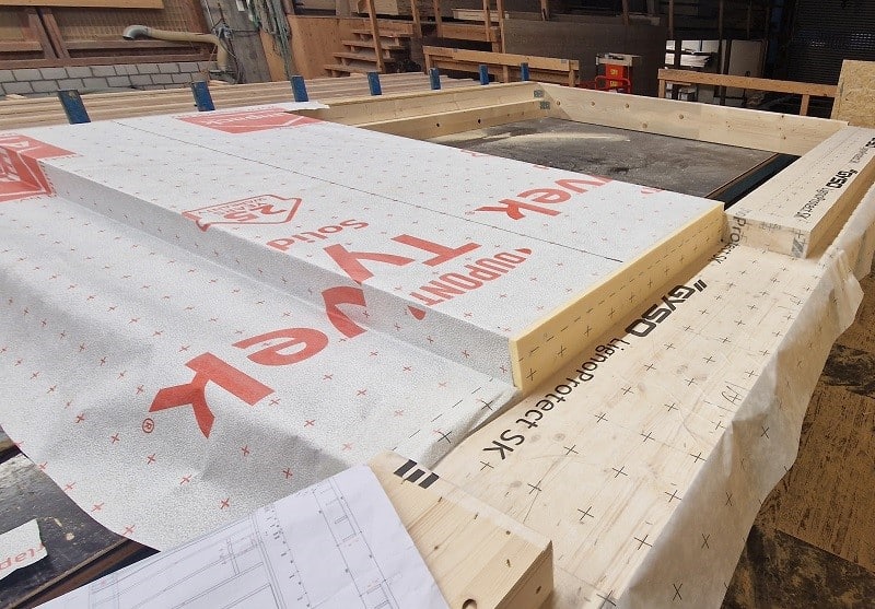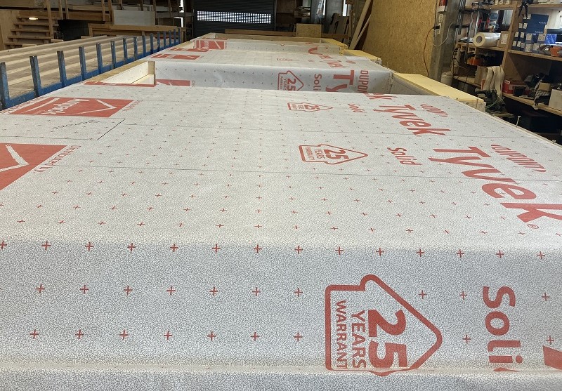 Holzelementbau (Statischer Hybridbau), Innere Verkleidungen, Holzfassade, Vordächer, Terrassenrost