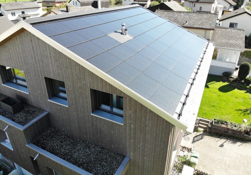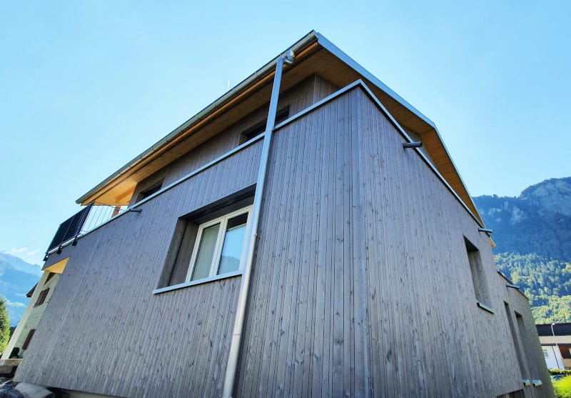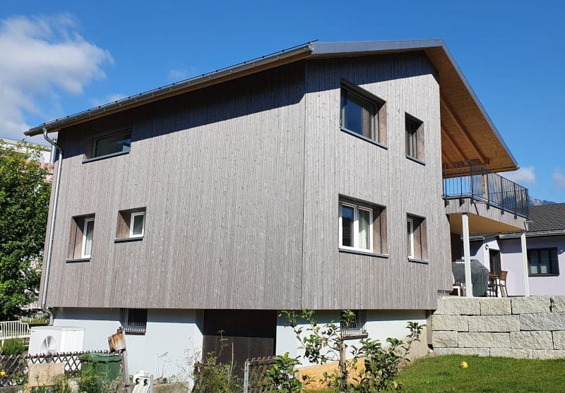Im neuen Dachgeschoss wurden 3 Zimmer und 1 grosses Badzimmer geschaffen, welche der Familie den notwendigen Platz und viel Lebensqualität bietet. Die vollintegrierte PV-Anlage auf dem Dach generiert Strom auf unauffällige Weise. Die Fassade wurde einheitlich mit einer vorvergrauten Holzschalung welche mit unterschiedlichen Breiten Spannung erzeugt versehen. Die gesamte Gebäudehülle erfüllt und übertrifft nun aktuelle Anforderungen an Energieeffizienz.