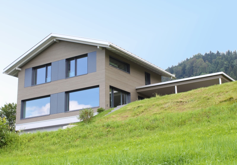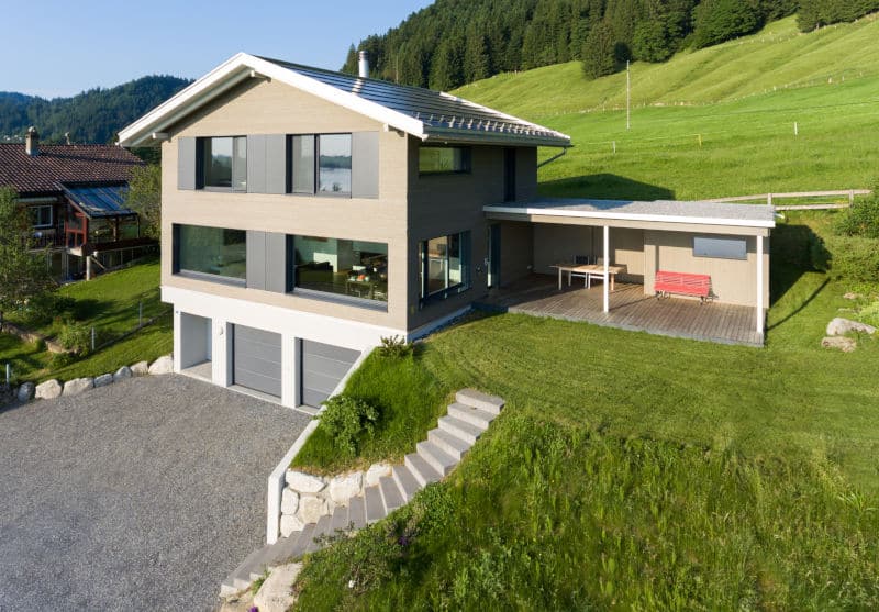 Elegante Proportionen, grosse Panoramafenster und raffinierte Details. Dies und viele weitere spannende Gegebenheiten machen das moderne Ferienhaus aus. Es weilt direkt über dem Sihlsee in Willerzell SZ und geniesst ein einmaliges Panorama, umgeben von vielen Grünflächen. Haus & Umgebung geben jedem Feriensuchenden die nötige Ruhe und Entspannung. Die vorvergraute Holzschalung kombiniert mit den Eterniteinsätzen, lassen an die ursprüngliche traditionelle Gebäudeoptik mit Fensterläden erinnern. Das gesamte Dach ist mit Photovoltaikpaneelen bedeckt. In Kombination mit Heizung & Dämmung erhält das Gebäude das Minergie-A Label.