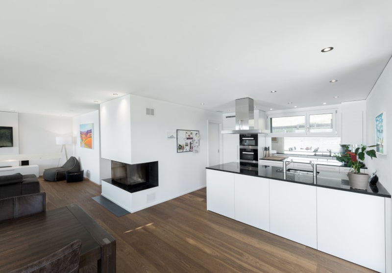Im Innenbereich schmücken edle, dunkle Parkettböden die Räume und eine clevere auffällige Holztreppe gibt auch dem Treppenhaus den gewissen Pfiff! Alles in Allem ein Holzelementbau mit schönen Besonderheiten.