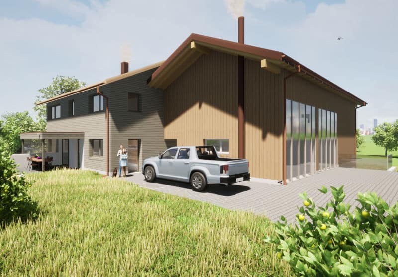 Beide Gebäude werden im Holzelementbau erstellt und erhalten eine Holzfassade, jedoch mit unterschiedlicher Optik, sodass sie sich klar voneinander trennen. Grosse Fenster tragen viel Licht in die Wohnung, welche über eine grosse Küche, Wohnraum mit schönster Aussicht, mehrere Zimmer und Estrichfläche verfügt. Die Eingangsbereiche werden mit grosszügigen Vordächern vor Witterung geschützt, aber auch die Fassade soll einen verstärkten Witterungsschutz erhalten.