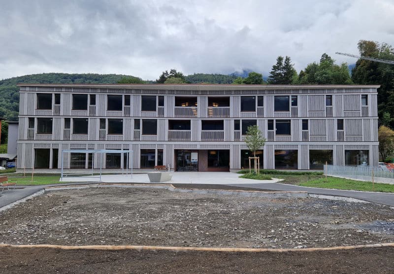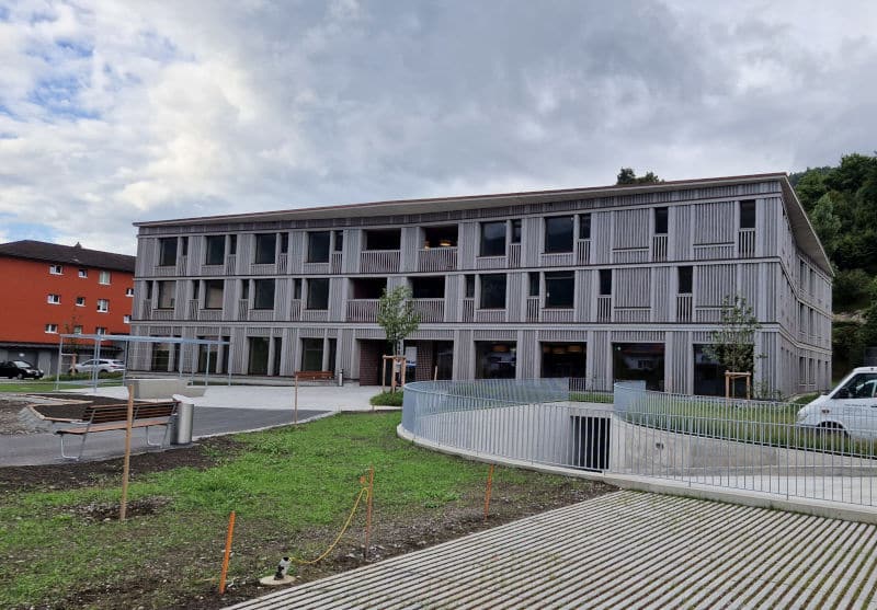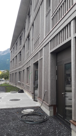 Für die Gemeinde Sevelen konnten wir beim Neubauprojekt „Casa Sevellun“, das als Alters- und Betagtenheim dient, die Aussenwärmedämmung und Holzfassade montieren. Die raffinierten Details mit verschiedenen Zierleisten, Bretter und Tiefen in der Fassade sind durch die Architektur geplant und von uns montiert worden. Der Dachausstieg wurde mit grossformatigen Eternitplatten verkleidet. In den beiden Innenhöfen bekommt man durch die verschiedenen Brettbreiten und Farben eine wohlwollende Atmosphäre. Das Herzstück der Fassade bildet der Eingangsbereich mit insgesamt knapp 900 kleinen, verschieden farbigen Holzstücken von 55x80mm.