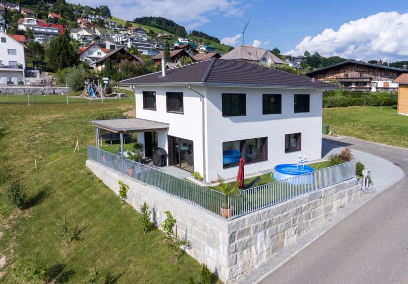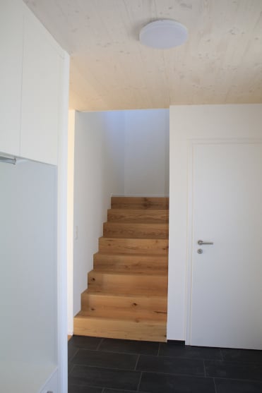 Das Untergeschoss, welches komplett im Terrain liegt, wurde in reiner Massivbauweise erstellt, wobei die oberen Stockwerke in effizienter Holzelementbauweise erstellt wurden. Die verputzte helle Fassade ergibt einen harmonischen Kontrast zu den dunklen Fenstern. Weiss lasierte Dreischichtplattendecke aus Fichte/Tanne zieren die Innenräume, lassen eine gewisse Holzstruktur leicht durchschimmern und geben den Räumen den garantierten Wohlfühl-Charakter. Grosse Fensterfronten lassen die Blicke in die Ferne schweifen und man kann die wundervolle Tal Sicht einfach nur geniessen.