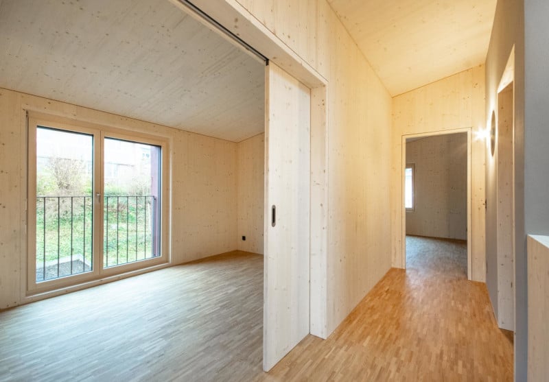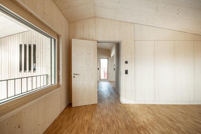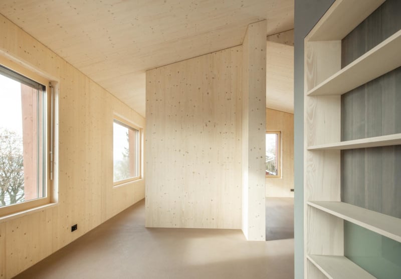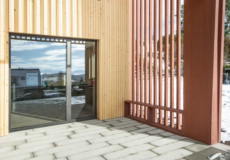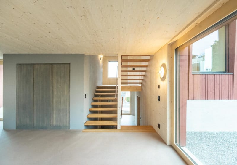 Die mehreren Geschosse des Holzbaus wurden mit unterschiedlichen Splittlevels gelöst und erhält dadurch einen sehr offenen Wohlfühlcharakter. Die mit Fichten 3-Schichtplatten bekleideten Decken und Wände wurden werkseitig fertig hergestellt und passen massgenau. Hier wirkt das Holz natürlich, elegant und gibt dem Holzhaus einen edlen Charakter. Die reine Holzelementbauweise mit Falu Vapen behandelter Holzfassade wurde von der Statik, Konzeptionierung bis zur fertigen Ausführung durch uns realisiert.