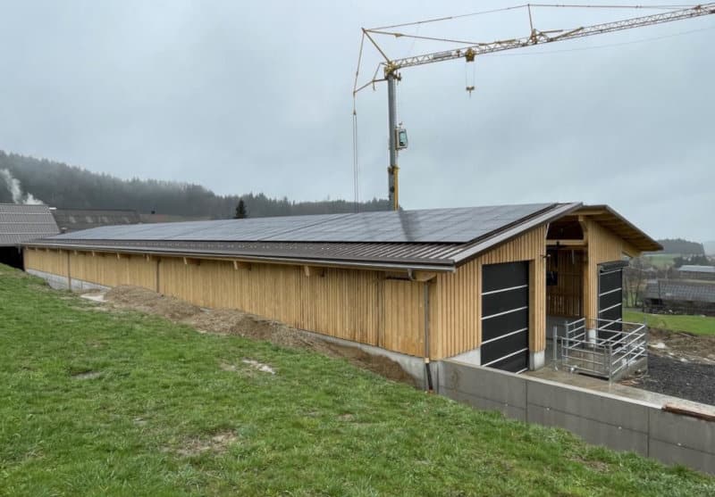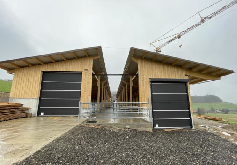 Projekt: Von der Projektierung bis zur Ausführung wurde der Rinderlaufstall für 100 Rinder von uns geplant und mit Schweizer Holz gebaut. Der innenliegende Laufhof mit perforierten Betonspaltenböden befindet sich auf dem Jauchetrog mit total 640m3 Volumen.