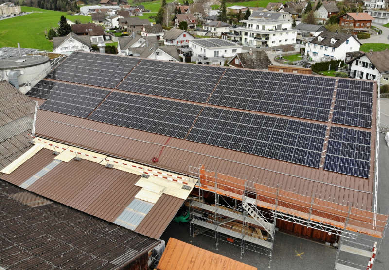 Im Zuge der Dachsanierung haben wir eine Aufdach PV-Anlage auf unsere Abbundhalle installiert. Die Anlage versorgt unseren Betrieb mit Solarenergie und deckt nahezu unseren Energieverbrauch ab. Somit können wir unsere nachhaltigen Holz Häuser mit Solarstrom produzieren.