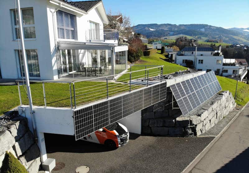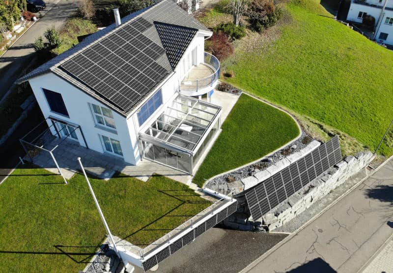 Projekt: PV-Anlage auf einem Ziegeldach und an einer Steinmauer. Da das Süddach nur Platz für eine kleine PV-Anlage hat, haben wir ebenfalls ein Modulfeld an der Steinmauer befestigt. Die Brüstung der Garageneinfahrt wurde auch optimal genutzt. Für die Eigenverbrauchserhöhung wurde der Boiler angesteuert.