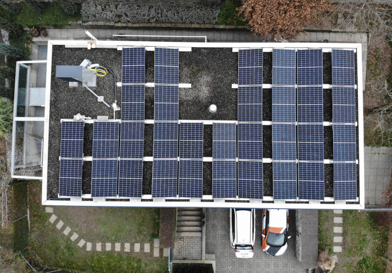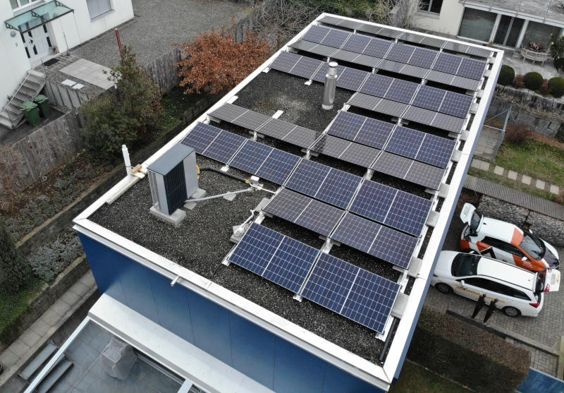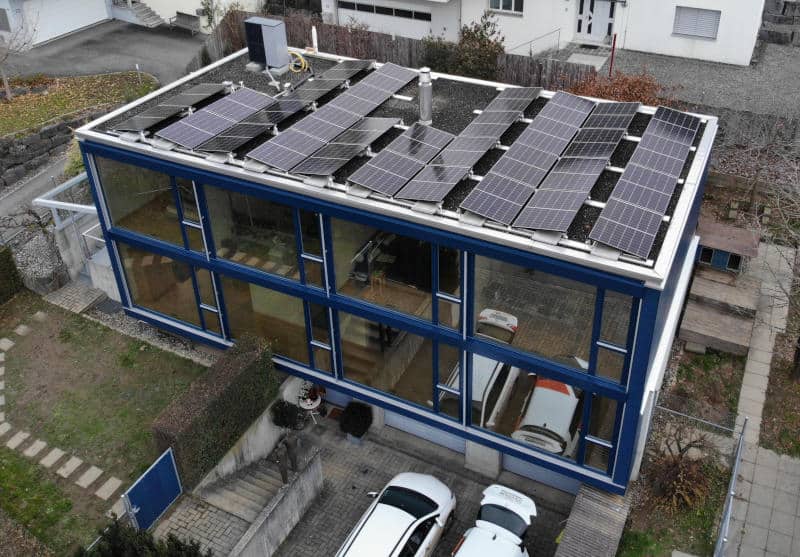 Projekt: Aufdach PV-Anlage auf ein bestehendes Flachdach. Das Dach wurde vollflächig belegt, einzig der Kamin und die Wärmepumpe haben die Anordnung der Module beeinflusst.