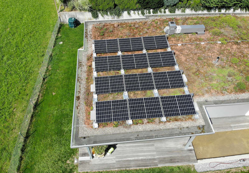 Aufdach PV-Anlage auf ein bestehendes Giebel- und Flachdach. Um einen optimalen Energieertrag zu erhalten, wurde die ost/west Anlage mit einem nach Süden ausgerichteten Feld ergänzt. Die Anlage verfügt über einen batteriefähigen Wechselrichter, damit dieser problemlos nachgerüstet werden kann. Es wurde eine intelligente Autoladestation installiert, damit das Elektroauto in Zukunft mit Überschussenergie geladen werden.
