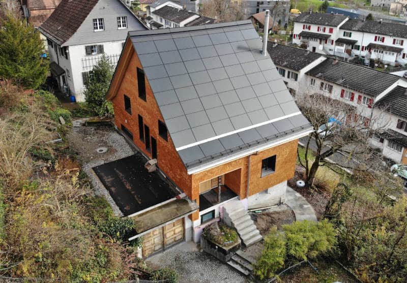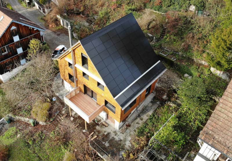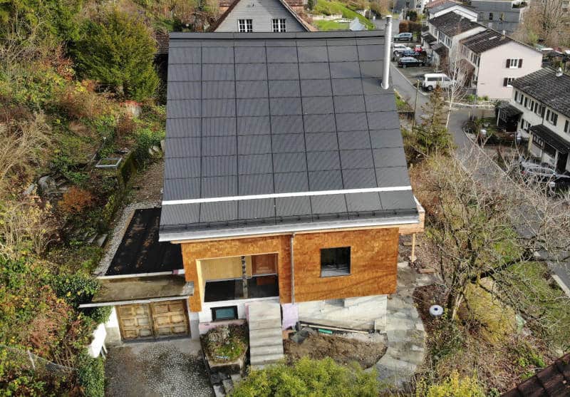 Projekt: Integrierte PV-Anlage vollflächig auf saniertes Giebeldach Ost-West ausgerichtet. Für eine optimale Ausnutzung der Dachfläche wurde diese auf die Masse der PV-Anlage angepasst. Da der Holzbauplaner und die Solarabteilung im selben Büro arbeiten, konnten die Schnittpunkte sauber und speditiv geplant werden.