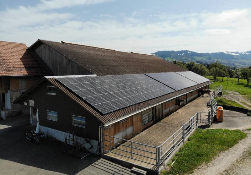 Auf dem Ökonomiegebäude in St.Gallenkappel wurde eine Aufdach PV-Anlage installiert. Da der obere Bereich des Daches als Sonnendach genutzt wird, wurde die PV-Anlage nur im unteren Bereich installiert. Die PV-Anlage versorgt den Betrieb sowie das Betriebsleiterhaus mit Solarenergie.